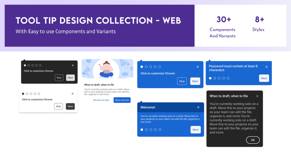 Elevate your web design with a comprehensive collection of over 30 tooltip components and variants, encompassing 8 distinct styles and catering to a wide range of design requirements.
